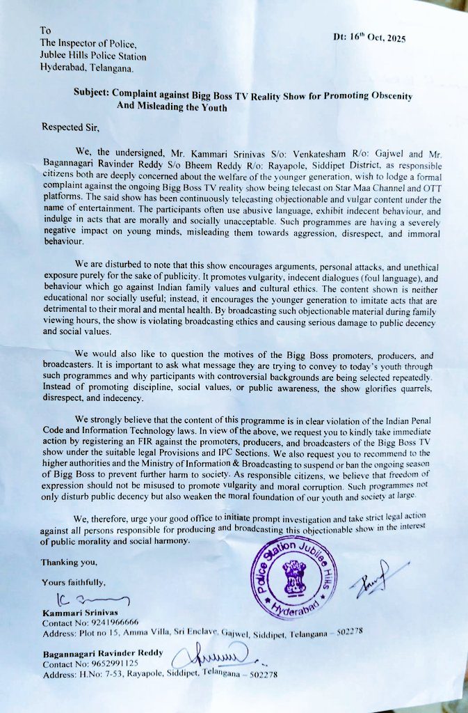 Bigg Boss Season 9 Telugu: తెలుగులో ప్రముఖ రియాలిటీ షో బిగ్బాస్ సీజన్ 9పై బంజారాహిల్స్ పోలీస్ స్టేషన్లో కేసు నమోదైంది. ఈ షోను నిలిపివేయాలంటూ గజ్వేల్కి చెందిన కమ్మరి శ్రీనివాస్, బి. రవీందర్ రెడ్డి గురువారం ఫిర్యాదు చేశారు. అశ్లీలాన్ని ప్రోత్సహిస్తూ యువతను తప్పు దోవ పట్టించేలా ఈ రియాలిటీ షో ఉందని ఫిర్యాదులో పేర్కొన్నారు. కాగా, బిగ్బాస్ సీజన్ 9ను తెలుగులో అక్కినేని నాగార్జున హోస్ట్ చేస్తున్నారు.