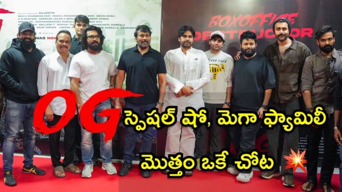 OG SPECIAL SHOW: పవర్ స్టార్ పవన్ కల్యాణ్ గారి లేటెస్ట్ గ్యాంగ్స్టర్ సంచలనం ‘ఓజీ’ (OG) బాక్సాఫీస్ను షేక్ చేస్తూ దూసుకుపోతోంది! ఈ మెగా విక్టరీని ఘనంగా సెలబ్రేట్ చేసుకునేందుకు, నిన్న (సోమవారం) సాయంత్రం హైదరాబాద్లోని ప్రసాద్ ల్యాబ్లో మెగా కుటుంబం అంతా ఒక్కటైంది. ఇదొక సాధారణ సినిమా షో కాదు. మెగా ఫ్యామిలీ మెంబర్స్ అంతా కలిసి తమ ‘పవర్’ను చాటుకున్న ఒక పండగ వాతావరణం!