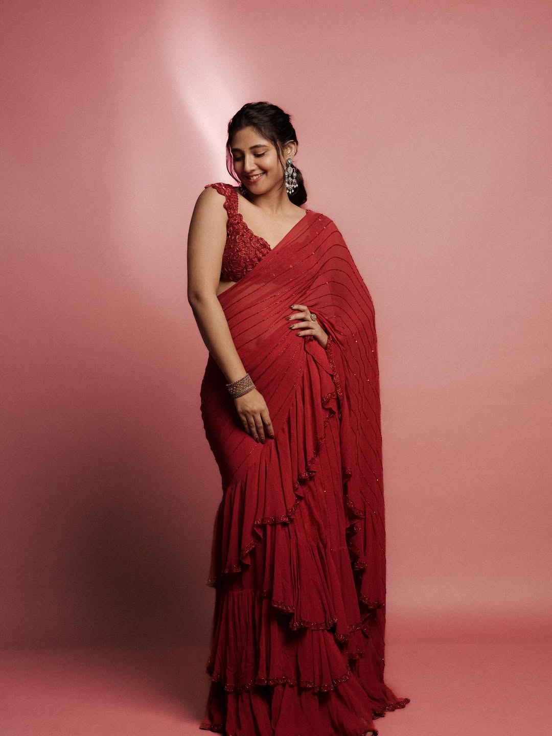 Ritika Nayak Saree stills: మిరాయ్ బ్యూటీ రితికా నాయక్ తన క్యూట్ లుక్స్ తో కుర్రకారును కట్టిపడేస్తోంది. తాజాగా ఈ చిన్నది రెడ్ శారీలో అందాలు ఆరబోసింది. ఈ ఫోటోలను చూసిన యువత పిచ్చెక్కిపోతున్నారు. మీరు కూడా ఓ లుక్కేయండి.
