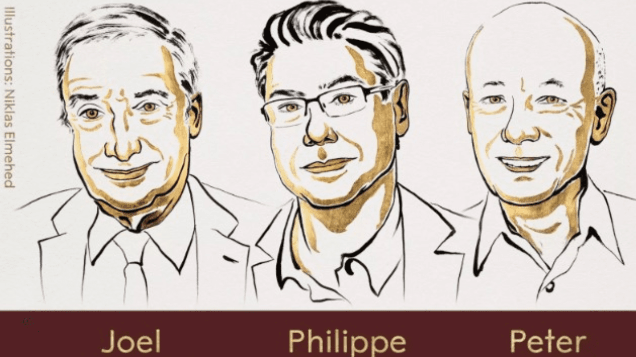 సాంకేతిక పురోగతి ద్వారా సుదీర్ఘకాలం పాటు కొనసాగే వృద్ధికి అవసరమైన ముందస్తు పరిస్థితులను చారిత్రక ఆర్థికవేత్త జోయెల్ మోకిర్కు గుర్తించారు. సమాజం కొత్త ఆలోచనలను అంగీకరించి, మార్పును అనుమతించినప్పుడే వృద్ధి సాధ్యమవుతుందని వివరించడంతో సగం బహుమతి జోయెల్ మోకిర్కుకి దక్కనుంది. ఫిలిప్ అగియోన్, పీటర్ హౌవిట్లకు మిగిలిన సగం బహుమతిని అందుకోనున్నారు.