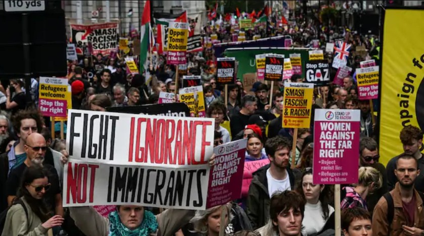 London protest: నేపాల్ లో జరిగిన భారీ స్థాయి ఆందోళనలు మర్చిపోకముందే.. బ్రిటన్లో మరో నిరసస జరిగింది. అక్కడ భారీ స్థాయిలో యాంటీ ఇమిగ్రేషన్ ర్యాలీ జరిగింది. లక్ష మందికి పైగా ప్రజలు రోడ్లపైకి వచ్చి ఈ ప్రదర్శనలో పాల్గొన్నారు. అదే సమయంలో జాత్యాహంకారానికి వ్యతిరేకంగా మరో నిరసన కార్యక్రమం కూడా జరిగింది. ఈ క్రమంలో పోలీసులపై ఆందోళనకారులు దాడులు చేశారు. శనివారం సెంట్రల్ లండన్లో జరిగిన ఈ ర్యాలీ యూకే (UK) చరిత్రలోనే అతి పెద్దదని మెట్రోపాలిటన్ పోలీసులు పేర్కొన్నారు. వలసలకు వ్యతిరేకంగా ఉద్యమిస్తున్న కార్యకర్త టామీ రాబిన్సన్ (Tommy Robinson) ఆధ్వర్యంలో ‘యునైట్ ది కింగ్డమ్’ ప్రదర్శన జరిగింది. అదే సమయంలో జాత్యాహంకారానికి వ్యతిరేకంగా ‘స్టాండ్ అప్ టు రేసిజమ్’ అనే మరో నిరసన కూడా చేపట్టారు. దీనిలో 5వేల మంది పాల్గొన్నారు. ఈ రెండు గ్రూపుల మధ్య ఎలాంటి ఘర్షణలు జరగకుండా ఉండేందుకు భారీగా పోలీసులు మోహరించారు. నిరసనకారులను చెదరగొట్టేందుకు వారు తీవ్రంగా ప్రయత్నించారు. ఈ క్రమంలో పోలీసులపైకి వాటర్ బాటిళ్లు, పలు వస్తువులతో ఆందోళనకారులు దాడులు చేశారు. ఈ ఘటనలో 26 మంది అధికారులు గాయపడినట్లు సమాచారం. వారిలో కొంత మంది పరిస్థితి విషమంగా ఉన్నట్లు సమాచారం.