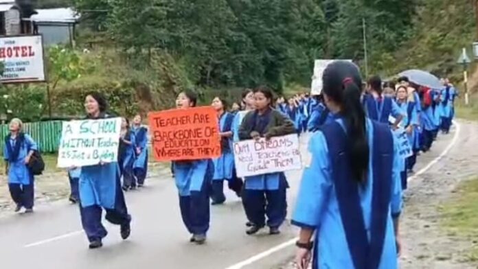 ఆదివారం సాయంత్రం న్యాంగ్నో గ్రామంలోని పాఠశాల నుంచి బయలుదేరిన విద్యార్థులు రాత్రంతా నడిచి ఉదయం జిల్లా కేంద్రం లెమ్మీకి చేరుకున్నారు. ప్లకార్డులు చేతబట్టి, నినాదాలు చేస్తూ తమ నిరసనను వ్యక్తం చేశారు. “టీచర్లు లేని పాఠశాల కేవలం ఒక భవనం మాత్రమే” అని రాసి ఉన్న ప్లకార్డులు అందరినీ ఆకట్టుకున్నాయి. ఈ పాదయాత్రకు 11వ తరగతి, 12వ తరగతి విద్యార్థులు నాయకత్వం వహించారు.