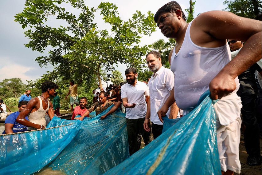 బిహార్ అసెంబ్లీ ఎన్నికల ప్రచారంలో భాగంగా రాహుల్ గాంధీ.. బెగుసరాయ్ జిల్లాలో పర్యటిస్తున్నారు. అక్కడ ఆయన మత్స్యకారులతో కలిసి చేపల వేటకి దిగారు. ఉమ్మడి ర్యాలీలు, సభల్లో బిజీగా ఉన్న రాహుల్ గాంధీ, తేజస్వి యాదవ్ ఇద్దరూ.. పట్నాలోని ఒక చెరువుకు వెళ్లి అక్కడ వారు ఫిషింగ్ చేసేందుకు నీళ్లలోకి దిగారు. ఇందుకు సంబంధించిన ఫొటోలు, వీడియోను కాంగ్రెస్ పార్టీ ‘ఎక్స్’ వేదికగా పోస్ట్ చేయడంతో తెగ వైరల్ అవుతోంది.