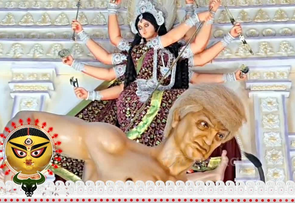 దృశ్యం: చాముండేశ్వరి రూపంలో ఉన్న దుర్గామాత తన త్రిశూలంతో రాక్షస రూపంలో ఉన్న ట్రంప్ను సంహరిస్తున్నట్లుగా ఉంది.