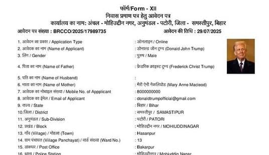 బిహార్లోని సమస్తిపుర్ జిల్లా, మోహియుద్దీన్నగర్ బ్లాక్ ప్రభుత్వ పోర్టల్లో జులై 29న ఓ వింత దరఖాస్తు ప్రత్యక్షమైంది. దరఖాస్తుదారుడి పేరు: డొనాల్డ్ ట్రంప్. చిరునామా: వార్డ్ నంబర్ 13, హసన్పుర్ గ్రామం. దరఖాస్తు నంబర్: BRCCO /2025 /17989735. ఈ దరఖాస్తుతో పాటు ట్రంప్ ఫోటో, ఆధార్ కార్డు వివరాలు కూడా జత చేసి ఉన్నాయి.