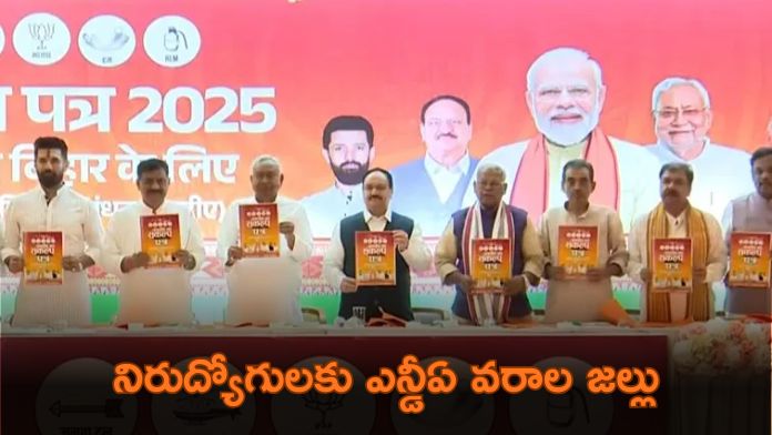 NDA releases manifesto promises 1 crore government job: బీహార్ దంగల్కు అన్ని పార్టీలు సిద్ధమవుతున్నాయి. ఓటింగ్ తేదీ సమీపిస్తున్న వేళ జోరుగా హామీలను గుప్తిస్తున్నాయి. అన్ని పార్టీలు మేనిఫెస్టో రిలీజ్ చేస్తూ ఓటర్లను ప్రసన్నం చేసుకునే పనిలో పడ్డాయి. ఈ నేపథ్యంలోనే అధికార జేడీయూ భాగస్వామ్యంలో ఉన్న ఎన్డీఏ కూటమి ఉమ్మడి మ్యానిఫెస్టోను రిలీజ్ చేసింది. ఈ మ్యానిఫెస్టోను కూటమిలోని అన్ని సీనియర్ నాయకుల సమక్షంలో విడుదల చేశారు. బీహార్ ఆర్థిక మంత్రి సామ్రాట్ చౌదరి ఈ మ్యానిఫెస్టోలోని అంశాలను మీడియాకు వివరించారు. రాబోయే ఐదేళ్లలో కోటి ఉద్యోగాలు.. కోటి మంది మహిళలను లక్షాధికారులను చేస్తామని స్పష్టం చేశారు. ప్రతి జిల్లాలో మెగా లెర్నింగ్ సెంటర్లతో బీహార్ను ప్రపంచ అభ్యాస కేంద్రంగా ఏర్పాటు చేస్తామని తెలిపారు. ఎన్డీఏ కూటమి మళ్లీ అధికారంలోకి రాగానే, ప్రతి జిల్లాలో 10 కొత్త ఇండస్ట్రియల్ పార్కులు, ఫ్యాక్టరీలు, 100 ఎంఎస్ఎంఈ పార్కులు, 50,000 కొత్త కుటీర పరిశ్రమలు ప్రారంభిస్తామని తెలిపింది. చిప్సెట్, సెమీకండక్టర్, మాన్యుఫాక్చరింగ్ పార్కుల ద్వారా ఐటీ, టెక్ రంగాలను బలోపేతం చేసేలా ప్లాన్ ఉంది. గిగ్ వర్కర్లు, ఆటో డ్రైవర్లకు ఆర్థిక సహాయం, స్కిల్ డెవలప్మెంట్ కల్పిస్తామని హామీ ఇచ్చారు. తదుపరి ఐదేళ్లలో రూ.50 లక్షల కోట్ల పెట్టుబడులను ఆకర్షిస్తూ, ‘మేడ్ ఇన్ బీహార్’ స్కీమ్ ద్వారా వ్యవసాయ ఎగుమతులను రెట్టింపు చేస్తామని తెలిపారు. కాగా, ఈ సమావేశంలో బీజేపీ జాతీయ అధ్యక్షుడు జగత్ ప్రకాష్ నడ్డా, ముఖ్యమంత్రి నితీష్ కుమార్, బీహార్ బీజేపీ ఎన్నికల ఇన్ఛార్జ్ ధర్మేంద్ర ప్రధాన్, హిందుస్తానీ అవామ్ మోర్చా (లౌకిక) వ్యవస్థాపకుడు, కేంద్ర మంత్రి జితన్ రామ్ మాంఝీ, లోక్ జనశక్తి పార్ట్ (రామ్ విలాస్) అధ్యక్షుడు చిరాగ్ పాశ్వాన్, రాష్ట్రీయ లోక్ మోర్చా (ఆర్ఎల్ఎం) అధ్యక్షుడు ఉపేంద్ర కుష్వాహా, జనతాదళ్ (యునైటెడ్) వర్కింగ్ ప్రెసిడెంట్ సంజయ్ ఝా, ఉప ముఖ్యమంత్రి సామ్రాట్ చౌదరి, బీజేపీ బీహార్ రాష్ట్ర అధ్యక్షుడు దిలీప్ కుమార్ జైస్వాల్ తదితరులు పాల్గొన్నారు.