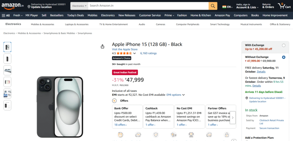 ప్రస్తుతం అమెజాన్ ఇండియాలో ఐఫోన్ 15ని రూ.11,901 డిస్కౌంట్ తర్వాత కేవలం ₹47,999 కి సొంతం చేసుకోవచ్చు. అమెజాన్ పే ఐసిఐసిఐ బ్యాంక్ క్రెడిట్ కార్డ్ తో రూ.1,439 వరకు డిస్కౌంట్ పొందవచ్చు. అదనంగా, ఈ ఫోన్ యాక్సిస్ బ్యాంక్ క్రెడిట్ కార్డ్ EMI పై రూ.500 బ్యాంక్ డిస్కౌంట్ తో లభిస్తుంది. ఇది ఈ పరికరం ధర గణనీయంగా తగ్గిస్తుంది. ఇది మాత్రమే కాదు, ఈ ఫోన్ను నెలకు రూ.2,327 నుండి ప్రారంభమయ్యే నో-కాస్ట్ EMI లో కూడా కొనుగోలు చేయవచ్చు. అంతేకాకుండా కస్టమర్లు మోడల్, కండిషన్ ఆధారంగా రూ.43,950 వరకు తమ పాత పరికరాన్ని ఎక్స్ఛేంజ్ చేసుకోవచ్చు.