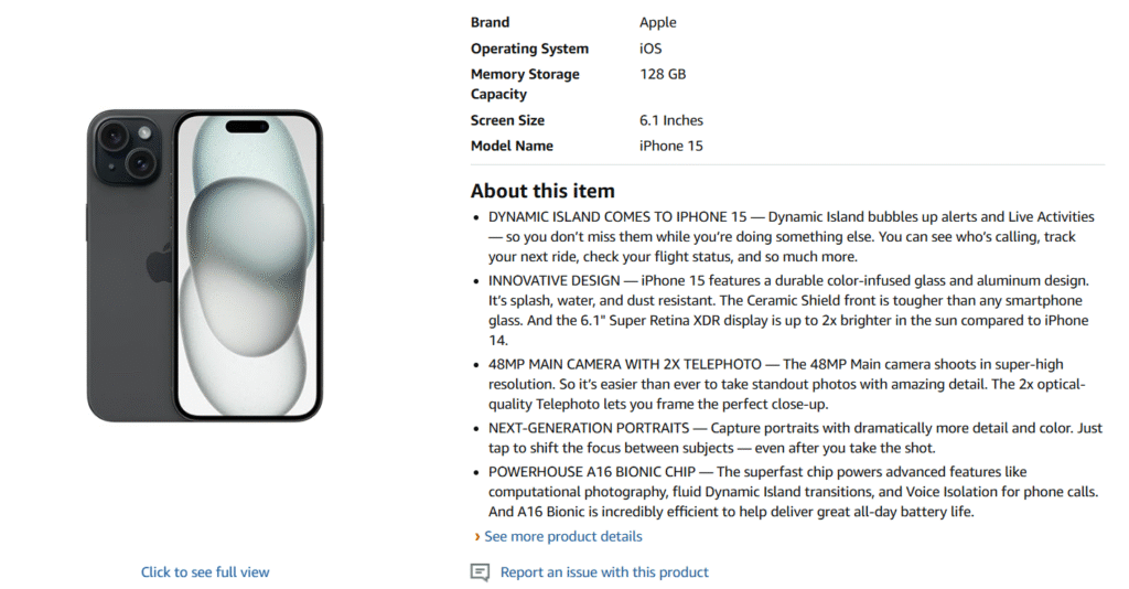 స్పెసిఫికేషన్ల పరంగా.. ఐఫోన్ 15 6.1-అంగుళాల OLED డిస్ప్లేను కలిగి ఉంటుంది. ఈ పరికరం 2,000 నిట్ల వరకు గరిష్ట ప్రకాశాన్ని అందిస్తుంది. ఇది ప్రకాశవంతమైన సన్ లైట్ లో కూడా సులభంగా కనిపిస్తుంది. అయితే, ఈ పరికరం 60Hz వరకు రిఫ్రెష్ రేటుకు మాత్రమే మద్దతు ఇస్తుంది. ఈ ఆకట్టుకునే ఆపిల్ పరికరం ఆపిల్ A16 బయోనిక్ చిప్ను కలిగి ఉంది.