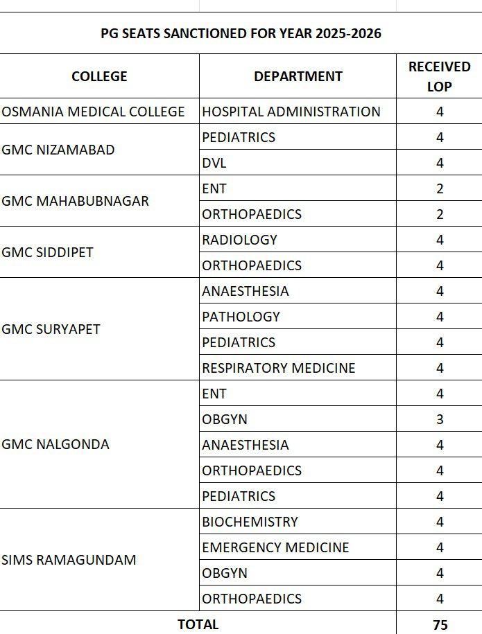 New Medicine PG Seats in Telangana: మెడిసిన్ విద్యార్థులకు తెలంగాణ ప్రభుత్వం తీపి కబురు చెప్పింది. పీజీ వైద్య విద్య సీట్ల భర్తీ విషయంలో వైద్య ఆరోగ్య శాఖ గుడ్ న్యూస్ తీసుకొచ్చింది. 2025- 26 విద్యా సంవత్సరానికి రాష్ట్రంలోని ప్రభుత్వ మెడికల్ కాలేజీల్లో మరో 75 పీజీ సీట్లకు నేషనల్ మెడికల్ కౌన్సిల్ గ్రీన్ సిగ్నల్ ఇచ్చింది. ఈ మేరకు రాష్ట్రంలోని కొత్త మెడికల్ కాలేజీల్లోనూ పీజీ సీట్లు కేటాయించినట్లు రాష్ట్ర వైద్యారోగ్య శాఖ అధికారికంగా ప్రకటన విడుదల చేసింది.