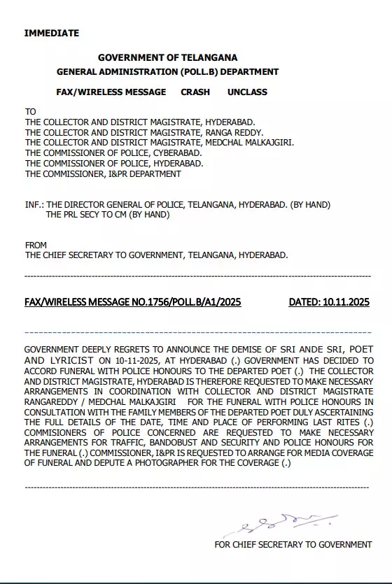 Andesri funeral with official honors: ప్రముఖ కవి, రచయిత అందెశ్రీ (64) ఇవాళ ఉదయం కన్నుమూసిన విషయం తెలిసిందే. హైదరాబాద్లోని నివాసంలో తీవ్ర అస్వస్థతకు గురైన ఆయనను కుటుంబ సభ్యులు గాంధీ ఆసుపత్రికి తరలించారు. అయితే అప్పటికే అందెశ్రీ మృతి చెందినట్లు వైద్యులు ధృవీకరించారు. అందెశ్రీ హఠాన్మరణంపై సీఎం రేవంత్ రెడ్డి దిగ్భ్రాంతి వ్యక్తం చేశారు. ఈ మేరకు ఆయన అంత్యక్రియలను ప్రభుత్వ అధికారిక లాంఛనాలతో జరిపించాలని సీఎస్ రామకృష్ణా రావును సీఎం ఆదేశించారు. అందుకు సంబంధించి ఉత్తర్వులు జారీ చేయాలని అధికారులకు సూచించారు. తగిన ఏర్పాట్లు చేయాలని అధికార యంత్రాంగానికి ఆదేశాలు జారీ చేశారు.