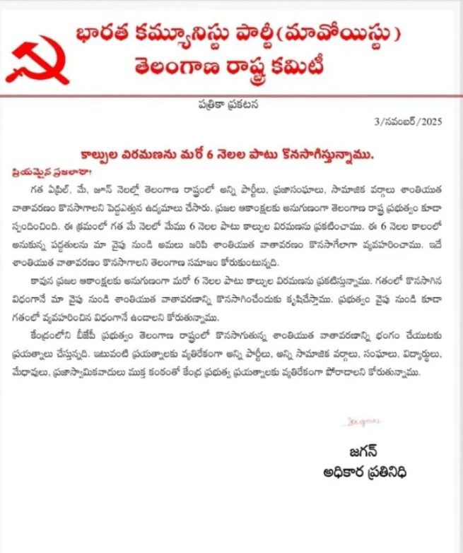 ప్రజల ఆకాంక్షల మేరకే ఈ నిర్ణయం: జగన్ : ఈ మేరకు మావోయిస్టు పార్టీ అధికార ప్రతినిధి జగన్ పేరుతో ఓ లేఖ విడుదలైంది. “తెలంగాణ సమాజం శాంతిని కోరుకుంటోంది. ఈ ఏడాది ఏప్రిల్, మే, జూన్ నెలల్లో రాష్ట్రంలోని అన్ని పార్టీలు, ప్రజాసంఘాలు శాంతియుత వాతావరణం కోసం ఉద్యమించాయి. ప్రజల ఆకాంక్షలను గౌరవిస్తూ, మే నెలలో మేము ఆరు నెలల పాటు కాల్పుల విరమణ ప్రకటించాం. ఆ గడిచిన ఆరు నెలల కాలంలో మా వైపు నుంచి సంయమనం పాటిస్తూ, శాంతికి విఘాతం కలగకుండా చూసుకున్నాం,” అని జగన్ ఆ లేఖలో పేర్కొన్నారు.