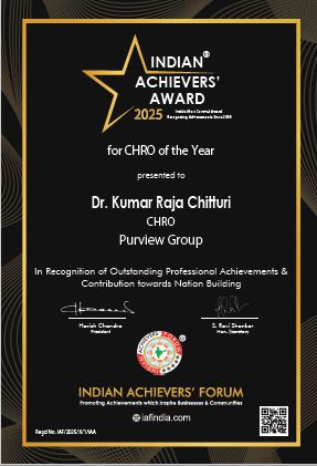 అభినందించిన బండి సంజయ్: పర్వ్యూ గ్రూప్ సంస్థల్లో సమానత్వం, సమగ్రత సంస్కృతిని నెలకొల్పడంలో ఆయన కీలక పాత్ర పోషించారు. డాక్టర్ కుమార్ రాజా చిట్టూరి వృత్తిపరంగానే కాక, సామాజిక సేవ, విద్యా రంగాల్లో విశేష కృషి చేశారు. యువ సాధికారత , గ్లోబల్ కార్పొరేట్ సహకారంలో అద్భుతమైన కృషికి గాను, ఆదికవి నన్నయ విశ్వవిద్యాలయం వైస్ ఛాన్సలర్ ఆయనను ప్రత్యేకంగా సత్కరించారు. కేంద్ర హోం శాఖ సహాయ మంత్రి బండి సంజయ్ సహా అనేకమంది ప్రముఖులు ఆయన నిబద్ధతను ప్రశంసించారు. డిసెంబర్ 2025లో లండన్లో జరగనున్న అంతర్జాతీయ హెచ్ఆర్ సమావేశంలో మానవ వనరుల నాయకత్వంపై డాక్టర్ కుమార్ రాజా చిట్టూరి ప్రధాన ప్రసంగం చేయనున్నారు.