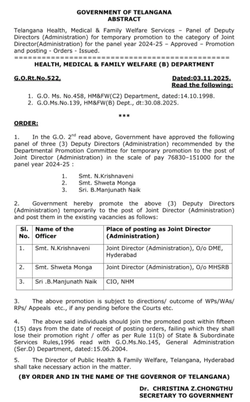 భారీగా ప్రమోషన్లు: రాష్ట్ర వ్యాప్తంగా మెడికల్ సేవలు మెరుగుపరచడం, ప్రభుత్వం నడిపే ఆసుపత్రుల్లో సిబ్బంది కొరతను తీర్చడమే తమ లక్ష్యమని వైద్య, ఆరోగ్య రంగానికి చెందిన ఉన్నతాధికారులు తెలిపారు. అయినప్పటికీ గత కొంతకాలంగా వైద్య, ఆరోగ్య శాఖలో పదోన్నతుల అంశం పెండింగ్లో ఉంటూ వస్తుంది. ఇదే విషయాన్ని ఉద్యోగులు ఇటీవల వైద్య, ఆరోగ్య శాఖ మంత్రి దామోదర్ రాజనర్సింహ దృష్టికి తీసుకెళ్లారు. ఈ మేరకు ఆయన సీఎం రేవంత్రెడ్డితో చర్చించి పదోన్నతులపై పలు కీలక నిర్ణయాలు తీసుకున్నారు. సీఎం రేవంత్ రెడ్డి ఆదేశాల మేరకు ముగ్గురు డిప్యూటీ డైరెక్టర్లకు జాయింట్ డైరెక్టర్లుగా పదోన్నతులు కల్పించారు. వారిలో కృష్ణవేణి, శ్వేత, మంజునాథ్ నాయక్లు ఉన్నారు. అదేవిధంగా మరో 36 మంది సివిల్ సర్జన్లకు సైతం ప్రమోషన్లు ఇస్తూ సంబంధిత శాఖ నుంచి అధికారిక ఉత్తర్వులు వెలువడ్డాయి. దీంతో వైద్య, ఆరోగ్య రంగాన్ని మరింత బలోపేతం కానుందని .. అధికార పార్టీ నేతలు తెలిపారు.