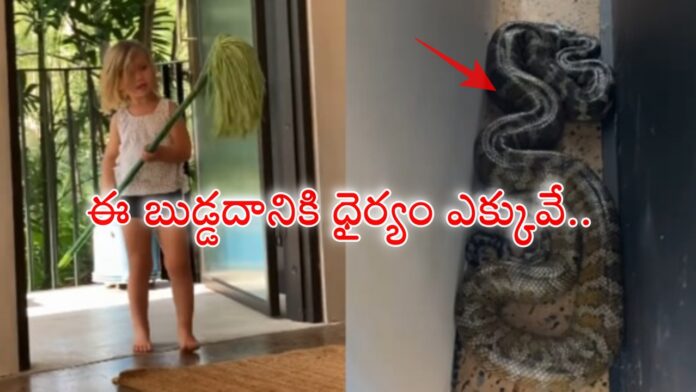 వైరల్ అవుతున్న ఈ వీడియోలో.. భారీ పాము ఓ ఇంట్లోకి దూరుతుంది. అది ఒక మూలన నక్కి ఉంటుంది. ఇంతలో దానిని ఆ ఇంటి యజమాని కూతురు చూస్తుంది. ఆ పాపకు నాలుగేళ్లు ఉండవచ్చు. పామును చూసిన విషయాన్ని వచ్చి తండ్రికి చెబుతుంది. అతడు ఏ మాత్రం కంగారు పడకుండా తన కూతురుని ఆ పామును బయటకు పంపించేలా ప్రోత్సహిస్తాడు. ముందుగా ఆ బుడ్డది భయపడిన నాన్న ఉన్నాడనే ధైర్యంతో ఆ పాము వద్దకు వెళ్తుంది. ముందుగా ఓ చిన్న మాపు కర్రను పట్టుకుని సర్పాన్ని బెదిరిస్తుంది. ఆ పాము నెమ్మదిగా పాకుతూ ఉంటుంది. అది చూడటానికి పది అడుగులు ఉంటుంది. అయినా సరే ఆ పాప ఏమాత్రం భయపడకుండా పాము వెంట పడుతుంది.