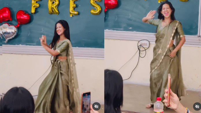 గౌహతికి చెందిన ఆశ్రిత అనే యువతి.. తాను చదువుకుంటున్న కాలేజీలో జరిగిన ఫ్రెషర్స్ డే వేడుకల్లో బాలీవుడ్ సూపర్ హిట్ సాంగ్ చిక్నీ చమేలీ పాటకి అదిరిపోయే స్టెప్స్ వేసింది. ఆమె డాన్స్ చేస్తున్నంత సేపు తోటి విద్యార్థులు ఉర్రూతలూగిపోయారు. అయితే ఇక్కడే ఓ అనుకోని సంఘటన చోటుచేసుకుంది. ఆశ్రిత డాన్స్ చేస్తుండగా మధ్యలో సడెన్గా చీర కుచ్చులు వదులయ్యాయి. అక్కడే తను సమయస్ఫూర్తి ప్రదర్శిస్తుంది.