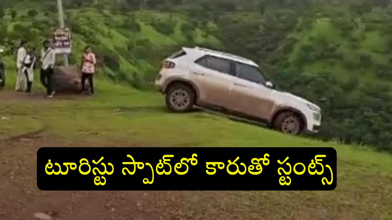 Car stunt at tourist Place in Maharashtra: సోషల్ మీడియాలో పాపులారిటీ సంపాదించేందుకు యువత చిత్ర విచిత్ర విన్యాసాలు చేస్తున్నారు. ఎంతటి రిస్క్ చేసైనా సరే ఫేమస్ అవ్వాలని చూస్తున్నారు. తాజాగా ఇలాంటి వీడియోనే ఒకటి సోషల్ మీడియాలో వైరల్ అవుతోంది. మహారాష్ట్రలో జరిగిన ఈఘటన యువకుడి ప్రాణాలమీదకు తీసుకొచ్చింది.