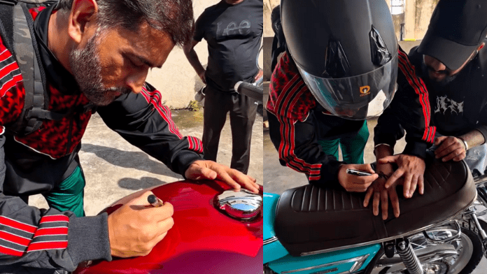 తన ఆటతీరుతో పాటు సింప్లిసిటీతో ప్రపంచ వ్యాప్తంగా అభిమానుల్ని సొంతం చేసుకున్న ధోనీకి ఫ్యాన్ ఫాలోయింగ్ అంతా ఇంతా కాదు. ధోనీకి సంబంధించిన ఏ చిన్న వీడియోనైనా సరే సోషల్ మీడియాలో వైరల్ అవుతుంది. తాజాగా, ఓ అభిమాని ధోనీని తన బైక్పై ఆటోగ్రాఫ్ అడిగాడు. వెంటనే స్పందించిన మిస్టర్ కూల్ బైక్ పెట్రోల్ ట్యాంక్పై తన సంతకం చేశాడు. అనంతరం తన చేతిపై కూడా సంతకం చేయాలని అభిమాని విజ్ఞప్తి చేశాడు. ఎక్కడ సైన్ చేయాలని అడగడంతో.. ‘ఎలా అయినా పర్లేదు సర్.. సైన్ చేయండి చాలు’ అని ఫ్యాన్ కోరాడు.