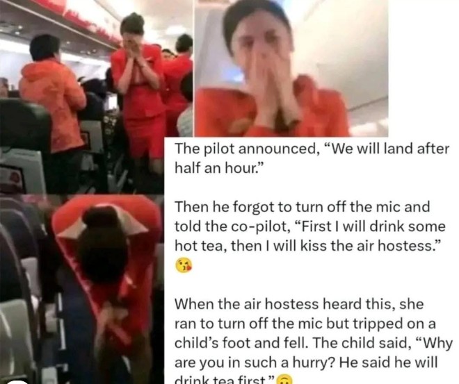 ఆ సమయంలో ఎయిర్ హోస్టెస్ కూడా ఈ మాటలు వినిపించడంతో ఆమెకు సిగ్గు ముంచుకొచ్చింది. వెంటనే ఆమె కాక్పిట్ వైపు వెళ్లి మైక్ ఆఫ్ చేయాలని తొందరపడి పరిగెత్తింది. కానీ హడావుడిలో ఆమె దూసుకెళ్తూ ఒక చిన్నపిల్ల కాలు మీద కాలు వేసి జారి పడిపోయింది. ఆ సంఘటనను చూసి కేబిన్లో ఉన్న వారు ఒక్కసారిగా ఉలిక్కిపడ్డారు. అయితే ఆ చిన్నపిల్ల తన అమాయకత్వంతో “ఇంత తొందర ఎందుకు? ఆయన ముందుగా టీ తాగుతానని అన్నాడు కదా” అని ప్రశ్నించాడు. ఆ మాట విన్న వెంటనే కేబిన్ అంతా నవ్వులతో మార్మోగిపోయింది.