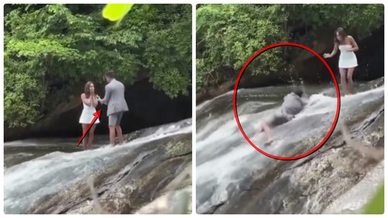 Man Proposing his Girlfriend near waterfall: వర్షాకాలంలో నదులు, వాగులు, వంకలు పొంగి పొర్లుతుంటాయి. దీని కారణంగా జలపాతాలు, డ్యామ్స్ ల్లోకి భారీగా వరద నీరు వచ్చి చేరుతుంది. దీంతో వాటిని చూసేందుకు ప్రజలు ఇష్టపడతారు. వానా కాలంలో వాటర్ ఫాల్స్ భారీ ప్రవాహంతో పరవళ్లు తొక్కుతూ కిందకు జాలువారుతూ ఉంటాయి. ఈ దృశ్యం చూడటానికి పర్యాటకులు అక్కడకి వెళుతుంటారు. రిస్క్ చేసి మరీ ఫోటోలు దిగడం, స్నానాలు చేయడం చేస్తారు. వాళ్లు ఏ మాత్రం అదుపు తప్పిన ప్రాణాలు గాల్లో కలిసిపోతాయి. ఇలా ప్రాణాలు పొగొట్టుకున్న ఘటనలు మనకు చాలానే కనిపిస్తాయి. ఇవన్నీ చూసినా సరే యూత్ మారడం లేదు. తాజాగా ఇలాంటి వీడియోనే ఒకటి సోషల్ మీడియాలో హల్ చల్ చేస్తోంది.